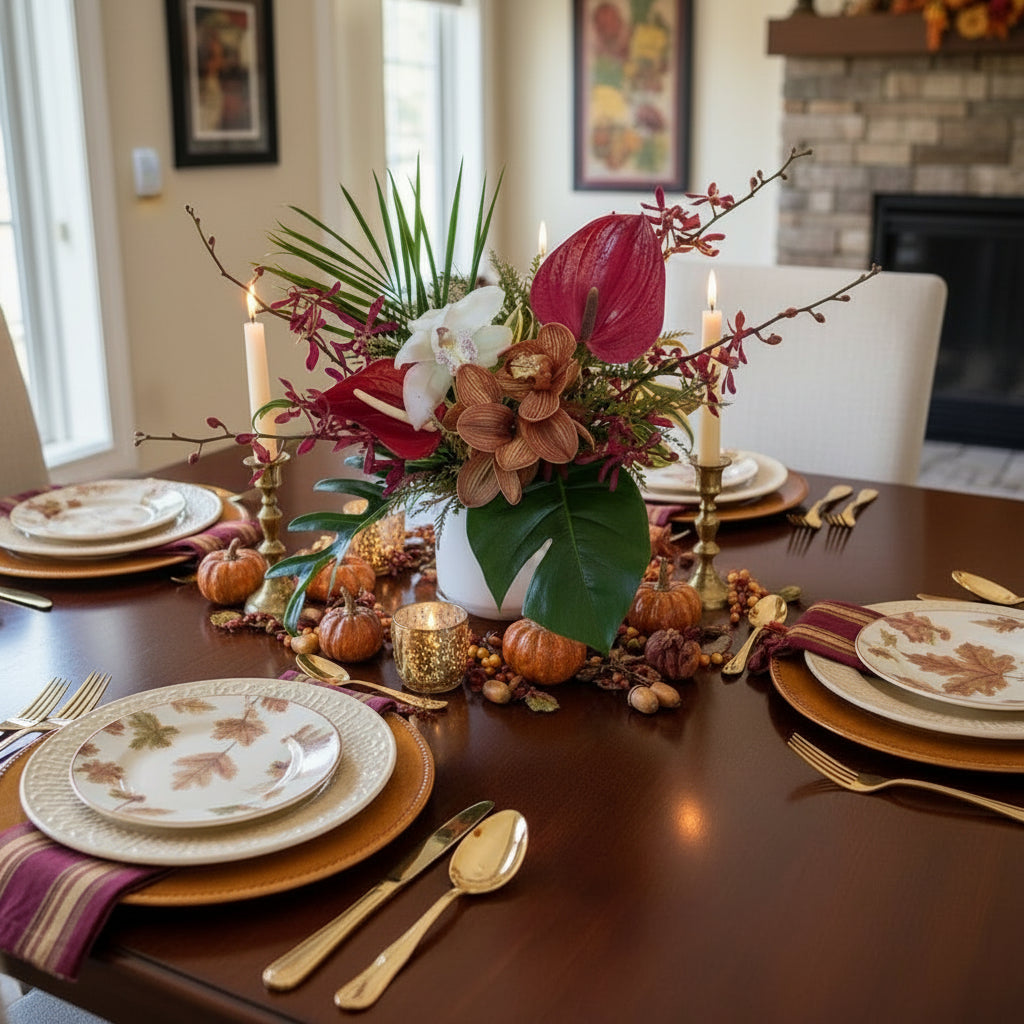 Slightly smaller than the medium size, but it still packs a punch! The Fall collection features a gorgeous mix of tropical and traditional flowers in a fall color palette. The perfect gift for the thanksgiving table, or to spread some holiday cheer!