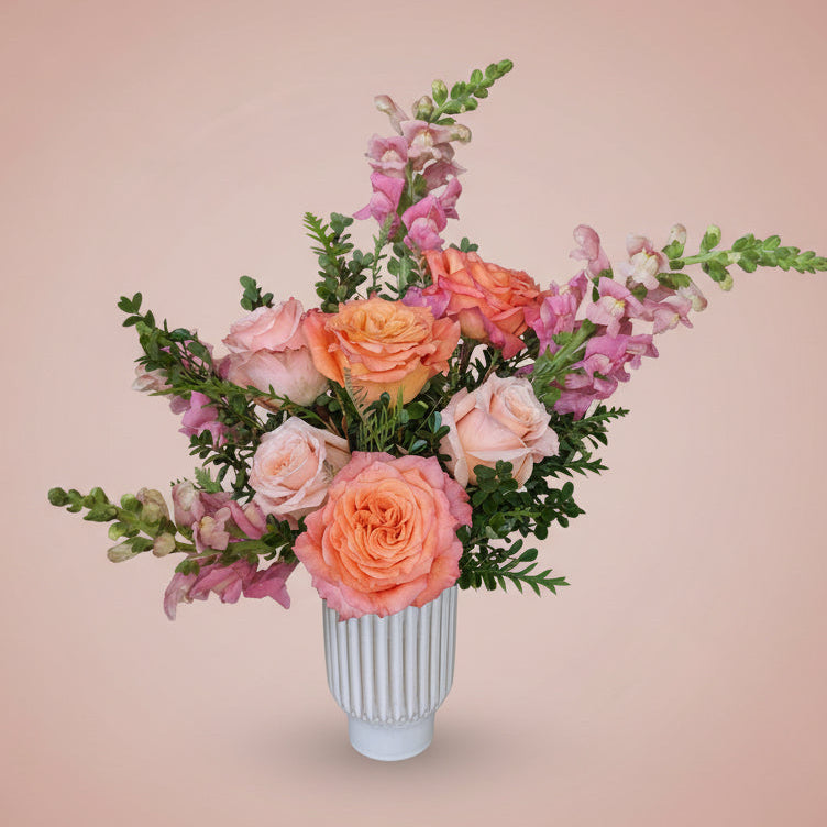 A small size arrangement featuring a garden rose known as the "Free Spirit" variety with fuschia tips and a rich orange center. Gorgeous and larger than a normal rose.